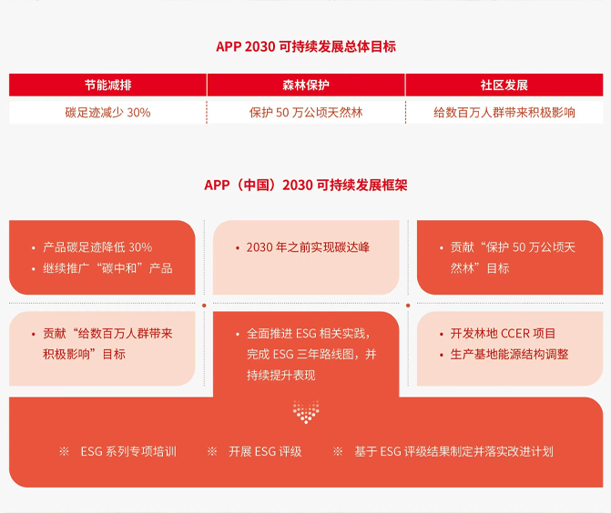 作为绿色可持续发展战略的先驱者和坚定实践者,自1992年进入中国以来,APP将国际先进的“林浆纸一体化”理念引入中国,从生态营林到环保制浆,再到绿色造纸,形成了“以林养纸、以纸促林、林纸结合”的“林浆纸一体化”绿色大循环。绿色循环产业链造就了APP中国坚实的固碳林地基础。2019年,启动林地碳汇核查项目,推进林木固碳能力。2020年,成立 “碳排放管控降碳增效” 跨部门机构,进一步完善碳排放管理机制,2021年,正式确定了2030可持续发展路线图,明确提出“2030年前实现碳足迹减少30%”的目标。